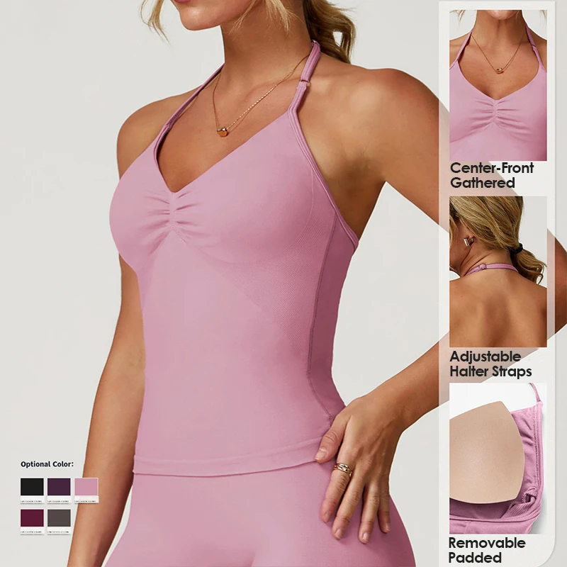 Women's Tummy Control V-neck Sports Camisoles Gym Top Nylon Crop Front Folds Custom Seamless Adjustable Strap Spandex Tank Tops